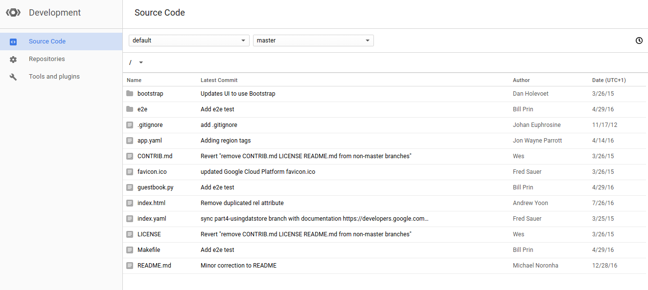 Ahora, regresa a tu consola de Google Cloud y, específicamente, a la sección Desarrollo. Haz clic en Código fuente y, en el repositorio predeterminado, deberías poder ver todos los archivos del proyecto. A continuación, se muestra el resultado de muestra: