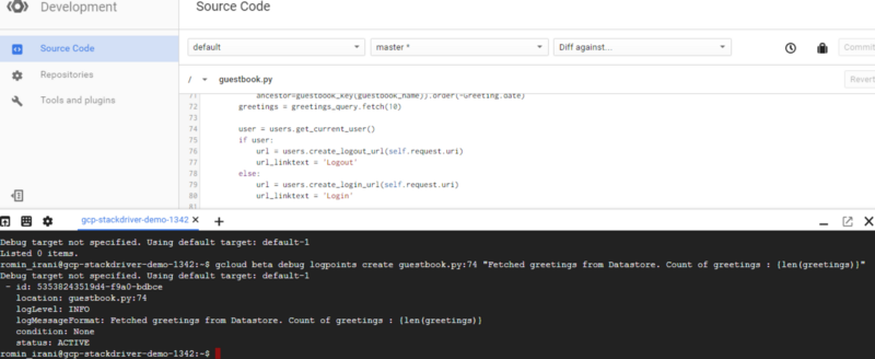 gcloud debug logpoints create guestbook.py:74 "Fetched greetings from Datastore. Count of greetings : {len(greetings)}"