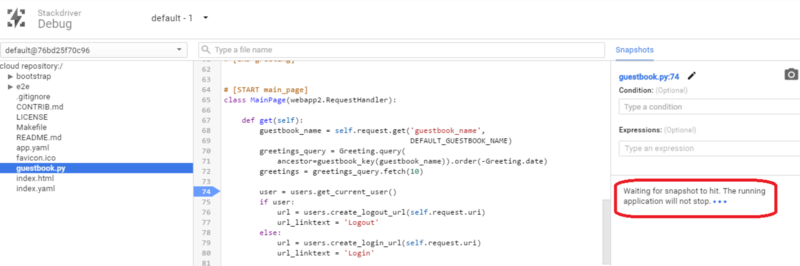 Para ello, haz clic en "Debug" en la vista de la versión de App Engine o ve a Stackdriver → Debug . Se mostrará la siguiente pantalla. Lo que debes hacer es seleccionar el archivo (guestbook.py