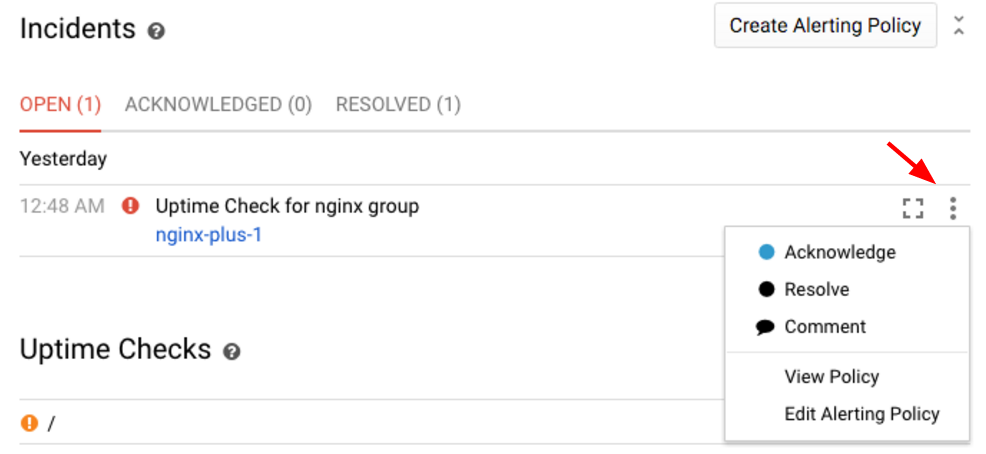 Los incidentes de Stackdriver se abren cuando un conjunto de condiciones de alerta cumple con ciertos criterios. En nuestro caso, configuramos una alerta para la verificación del tiempo de actividad de nginx, que actualmente falla en nginx-plus-1. Los incidentes te ayudan a hacer un seguimiento de las condiciones actuales y a colaborar con otros miembros del equipo cuando trabajas en problemas.