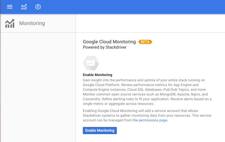 有効にすると、コンテンツが変更され、以下のテキストが表示されます。[モニタリングに移動] をクリックして、詳細を確認してください。Google でログインすると、プロジェクトの Stackdriver コンソールに移動します。ここで、モニタリング関連のタスクを実行して分析します。