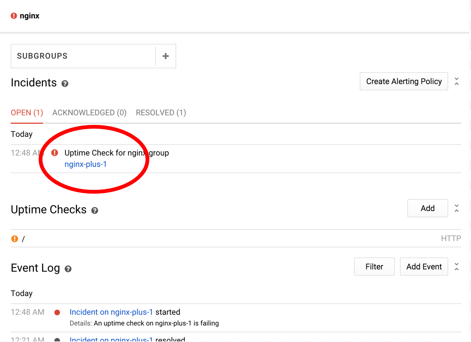 作成した稼働時間チェックが失敗します。その結果、インシデントが作成され、上記で入力したアドレスにアラート通知メールが送信されます。条件が検出されるまでに 1 分かかります(稼働時間チェックの設定時に 1 分の期間を設定したことを思い出してください)。nginx グループのページを確認しましょう。