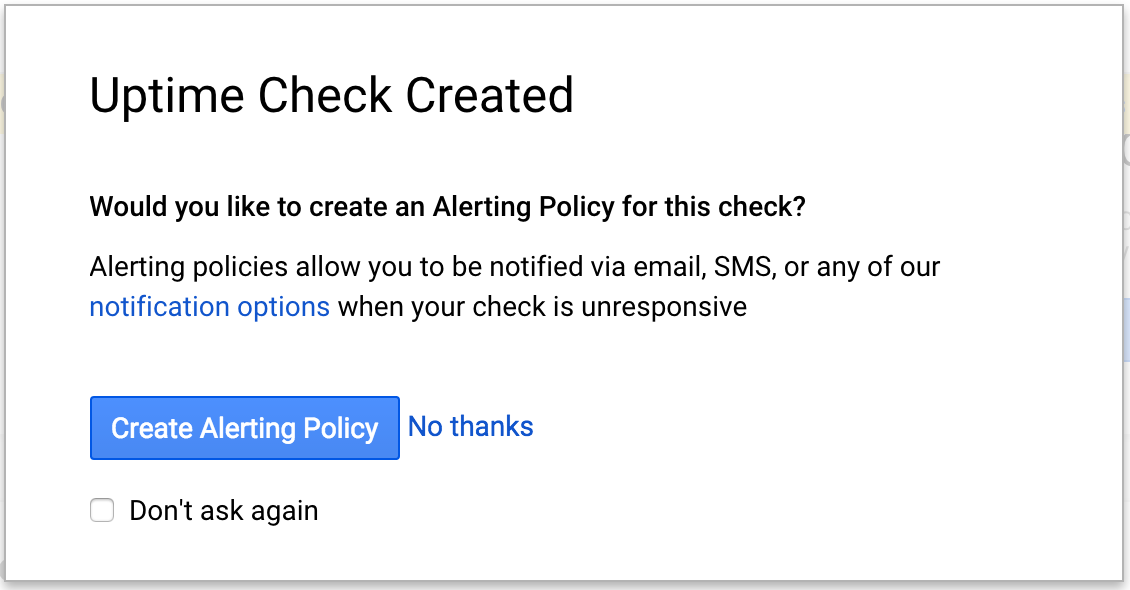 次に、[稼働時間チェックが作成されました] というボックスが表示され、このチェックのアラート ポリシーを作成するかどうかをたずねられます。次のセクションでその操作を行います。まだ何もクリックしないでください。