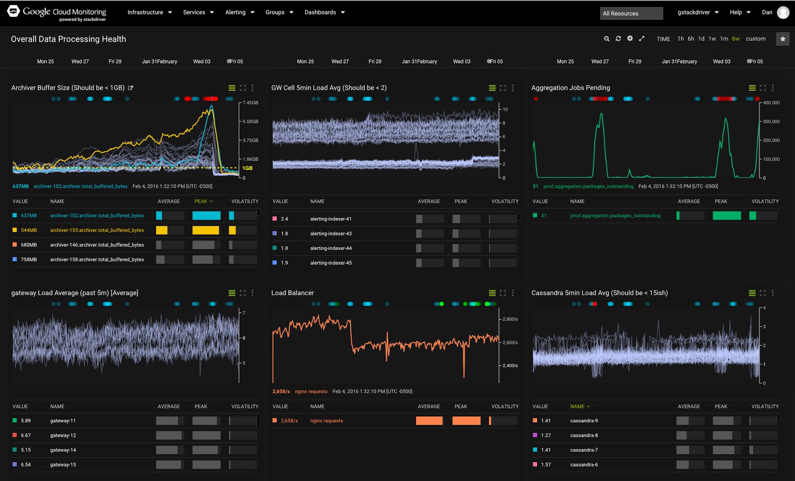 ダッシュボードとグラフの操作と使用方法をよく理解しておきましょう。グラフの線にマウスカーソルを合わせて、何が起こるかを確認します。グラフの期間を変更します(コントロールは右上隅にあります)。コンソールの左上隅にある Stackdriver ロゴをクリックすると、いつでも「ホームページ」ビューに戻ることができます。