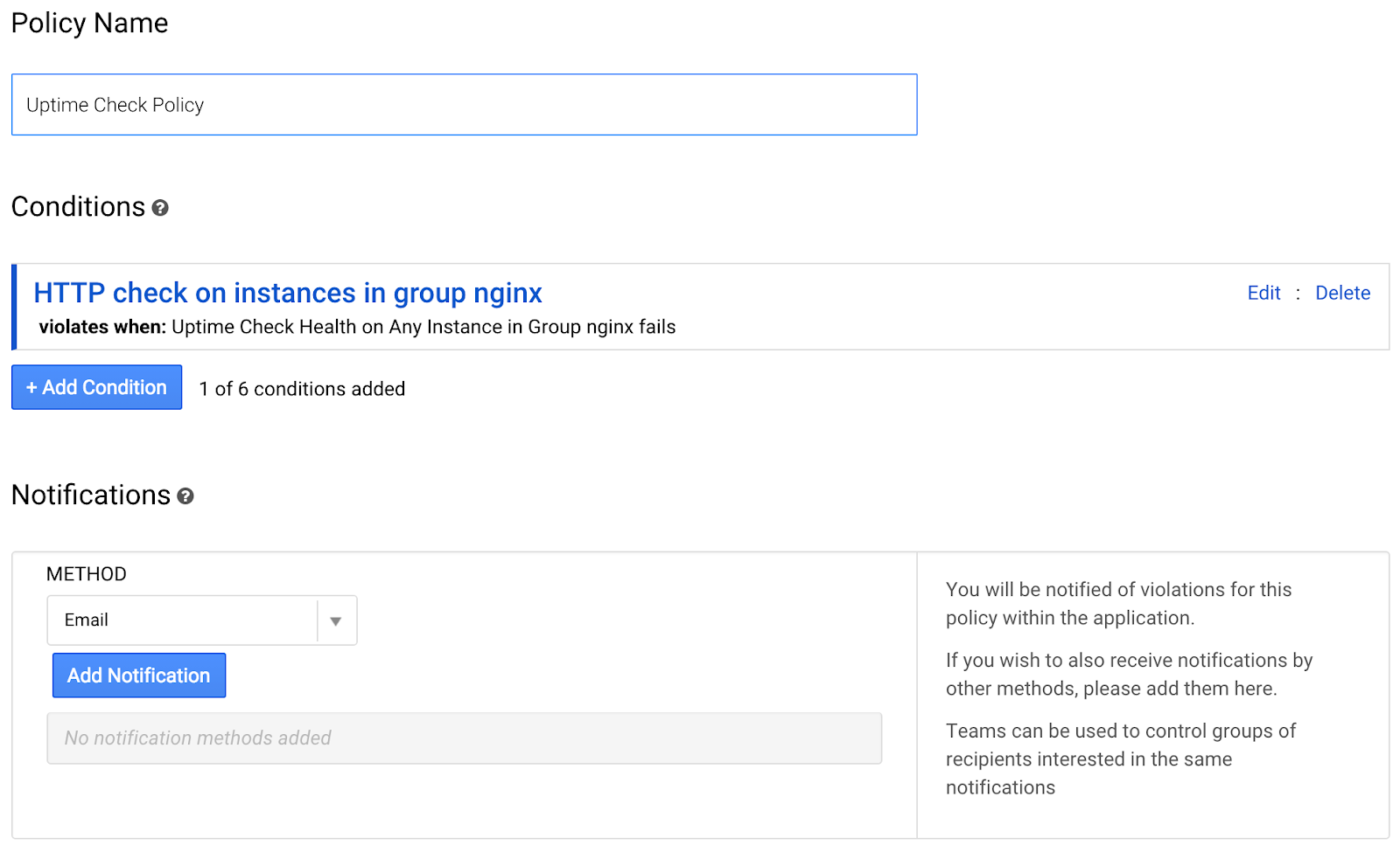Нажмите «Создать политику оповещений» и перейдем к настройке политики.