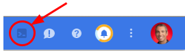 Большую часть работы вы будете выполнять в Google Cloud Shell — среде командной строки, работающей в облаке . Эта виртуальная машина на базе Debian содержит все необходимые инструменты разработки и предоставляет постоянный домашний каталог объёмом 5 ГБ. Откройте Google Cloud Shell, нажав на значок в правом верхнем углу экрана: