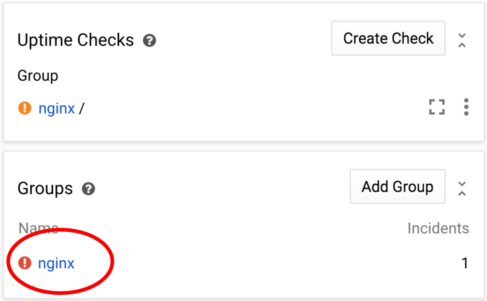 Теперь созданная нами проверка работоспособности должна завершиться неудачей. В результате будет создан инцидент и на указанный вами адрес электронной почты будет отправлено уведомление. Обнаружение условия займёт минуту (помните про продолжительность в 1 минуту при настройке проверки работоспособности?), поэтому давайте проверим страницу группы nginx.