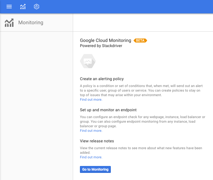 После включения контент изменится, и вы увидите текст ниже. Нажмите «Перейти к мониторингу», чтобы начать! Вам нужно будет войти в систему через Google, после чего вы перейдете в консоль Stackdriver для вашего проекта — здесь вы будете выполнять и анализировать задачи, связанные с мониторингом.