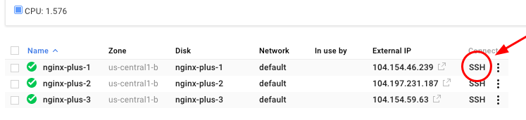 NAME ZONE MACHINE_TYPE PREEMPTIBLE INTERNAL_IP EXTERNAL_IP STATUS nginx-plus-1 us-central1-b n1-standard-2 X.X.X.X X.X.X.X RUNNING ...