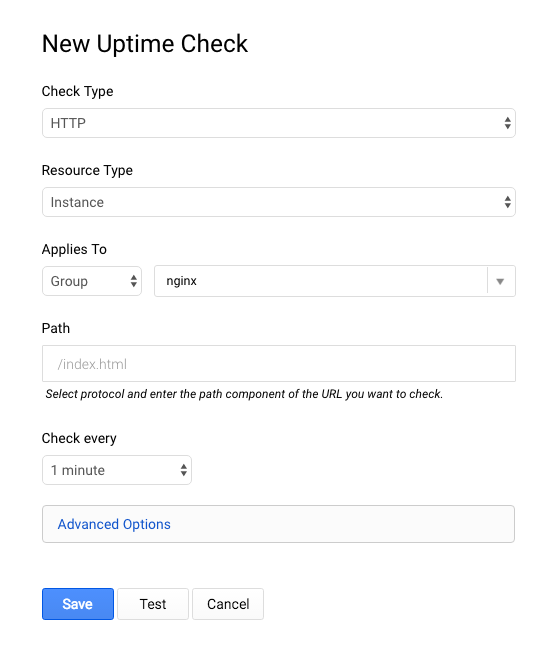 ป๊อปอัปใหม่จะปรากฏขึ้น เราสามารถกำหนดค่าการตรวจสอบเวลาทำงานสำหรับทรัพยากรเดียวหรือกลุ่มทรัพยากร ใช้ประโยชน์จากส่วนหัวและเพย์โหลดที่กำหนดเอง เพิ่มการตรวจสอบสิทธิ์ และตัวเลือกอื่นๆ ตอนนี้เราจะใช้การตรวจสอบ HTTP เริ่มต้นที่จะตรวจสอบกลุ่ม Nginx ที่สร้างขึ้นโดยอัตโนมัติทุกๆ 1 นาที
