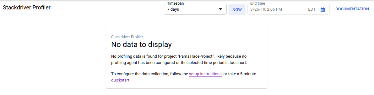 Como alternativa, puedes usar la barra de búsqueda de Cloud Console para navegar a la IU de Profiler. Solo escribe "Stackdriver Profiler" y selecciona el elemento encontrado. De cualquier manera, deberías ver la IU de Profiler con el mensaje "No hay datos para mostrar", como se muestra a continuación. El proyecto es nuevo, por lo que aún no tiene datos de generación de perfiles recopilados.