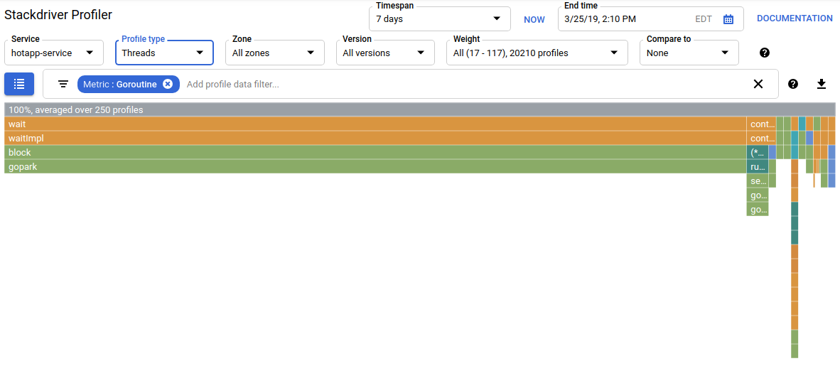 }סוג הפרופיל הזה שימושי כדי להבין אם התוכנית מבזבזת זמן לא צפוי בהמתנות (כמו קלט/פלט). בדרך כלל, פרופיל המעבד לא יכלול דגימה של מחסניות קריאות כאלה, כי הן לא צורכות חלק משמעותי מזמן המעבד. לעתים קרובות כדאי להשתמש במסננים מסוג 'הסתרת ערימות' עם פרופילים של Threads – לדוגמה, כדי להסתיר את כל הערימות שמסתיימות בקריאה ל-gopark,, כי אלה לרוב שגרות משנה במצב המתנה ולא מעניינות כמו אלה שממתינות לקלט/פלט.