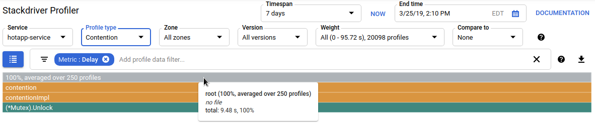 Typ profilu rywalizacji określa najbardziej „pożądane” blokady w programie. Ten typ profilu jest dostępny w przypadku programów w Go, ale musi być jawnie włączony przez podanie wartości „MutexProfiling: true” w kodzie konfiguracji agenta. Kolekcja działa poprzez rejestrowanie (w ramach rodzaju danych „Contentions”) liczby przypadków, w których określona blokada, odblokowywana przez gorutynę A, miała inną gorutynę B oczekującą na odblokowanie. Rejestruje też (w ramach danych „Opóźnienie”) czas, przez jaki zablokowana gorutyna czekała na blokadę. W tym przykładzie jest jeden stos rywalizacji, a łączny czas oczekiwania na blokadę wynosił 11,03 sekundy: