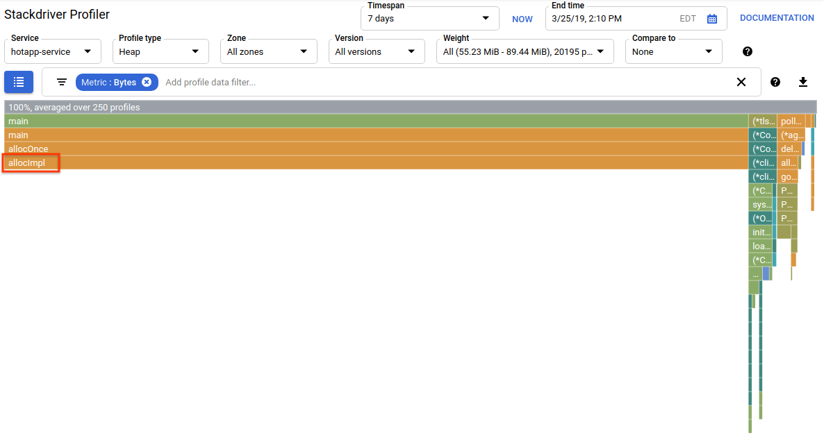 Bảng tóm tắt phía trên biểu đồ ngọn lửa cho biết tổng dung lượng bộ nhớ đã dùng trong ứng dụng trung bình là ~57,4 MiB, phần lớn dung lượng này được phân bổ bởi hàm allocImpl. Điều này không có gì đáng ngạc nhiên, vì việc triển khai hàm này như sau: