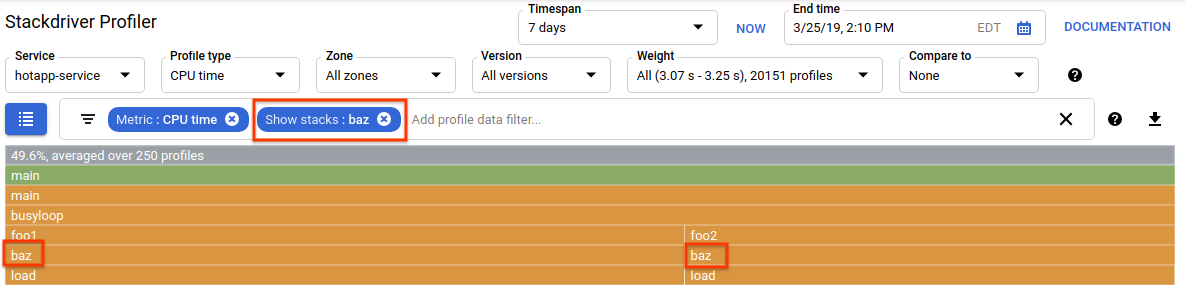 Bạn có thể sử dụng bộ lọc dữ liệu hồ sơ để tinh chỉnh thêm chế độ hiển thị. Ví dụ: hãy thử thêm bộ lọc "Show stacks" (Hiện ngăn xếp) và chỉ định "baz" làm chuỗi bộ lọc. Bạn sẽ thấy một hình ảnh như ảnh chụp màn hình bên dưới, trong đó chỉ có 2 trong số 4 đường dẫn lệnh gọi đến load() được hiển thị. Hai đường dẫn này là hai đường dẫn duy nhất đi qua một hàm có chuỗi "baz" trong tên. Việc lọc này sẽ hữu ích khi bạn muốn tập trung vào một phần nhỏ của một chương trình lớn hơn (ví dụ: vì bạn chỉ sở hữu một phần của chương trình đó).