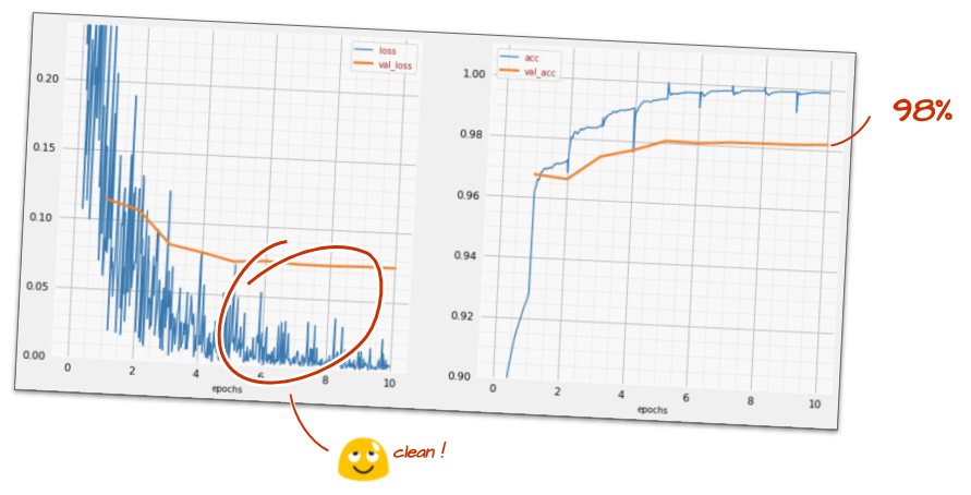 Sembra che questa volta l'abbandono sia andato a buon fine. La perdita di convalida non aumenta più e l'accuratezza finale dovrebbe essere superiore al 99%. Complimenti!