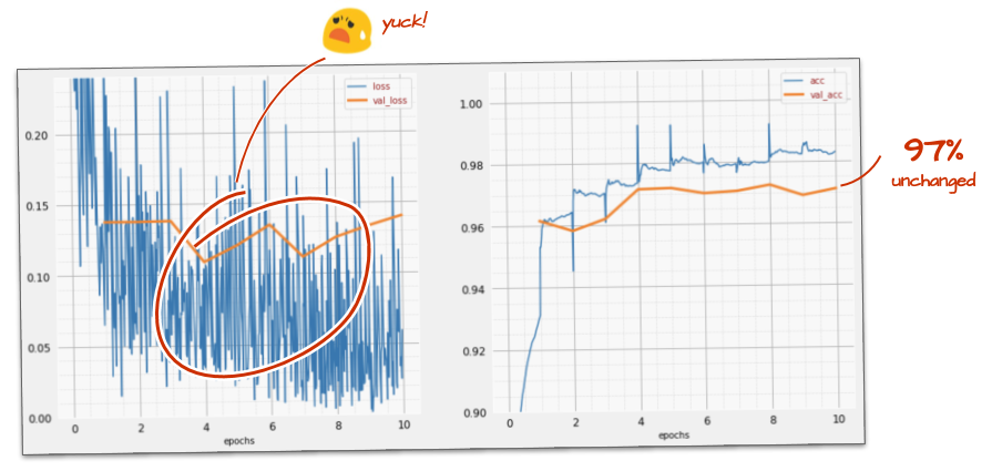 Le curve di addestramento sono molto irregolari e guarda entrambe le curve di convalida: oscillano su e giù. Ciò significa che stiamo andando troppo veloci. Potremmo tornare alla velocità precedente, ma c'è un modo migliore.