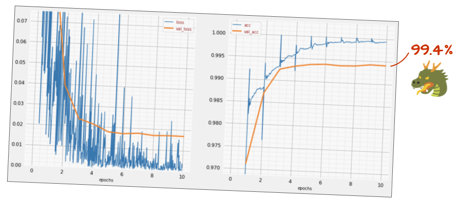 今回はドロップアウトが機能したようです。検証損失は増加しなくなり、最終的な精度は 99% を大幅に超えるはずです。お疲れさまでした