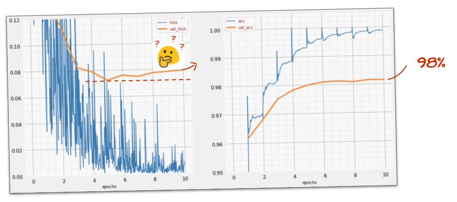 아니요. 정확도는 여전히 98% 에 머물러 있고 검증 손실을 살펴보세요. 올라가고 있습니다. 학습 알고리즘은 학습 데이터에서만 작동하며 이에 따라 학습 손실을 최적화합니다. 검증 데이터를 보지 못하므로 시간이 지나면 작업이 더 이상 검증 손실에 영향을 미치지 않아 검증 손실이 감소하지 않고 때로는 다시 반등하는 것은 놀라운 일이 아닙니다.
