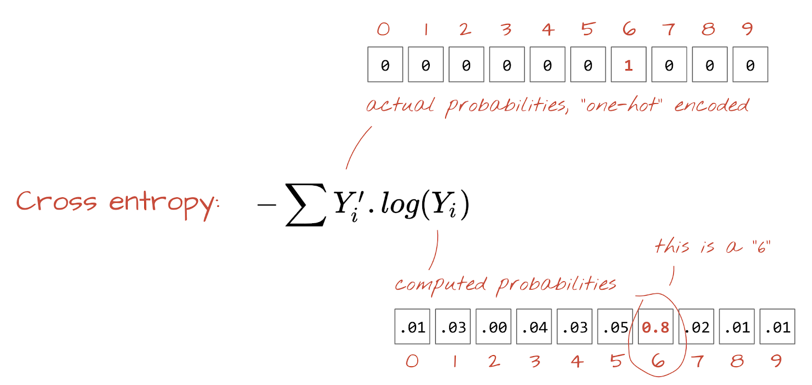 교차 엔트로피는 가중치, 편향, 학습 이미지의 픽셀, 알려진 클래스의 함수입니다.