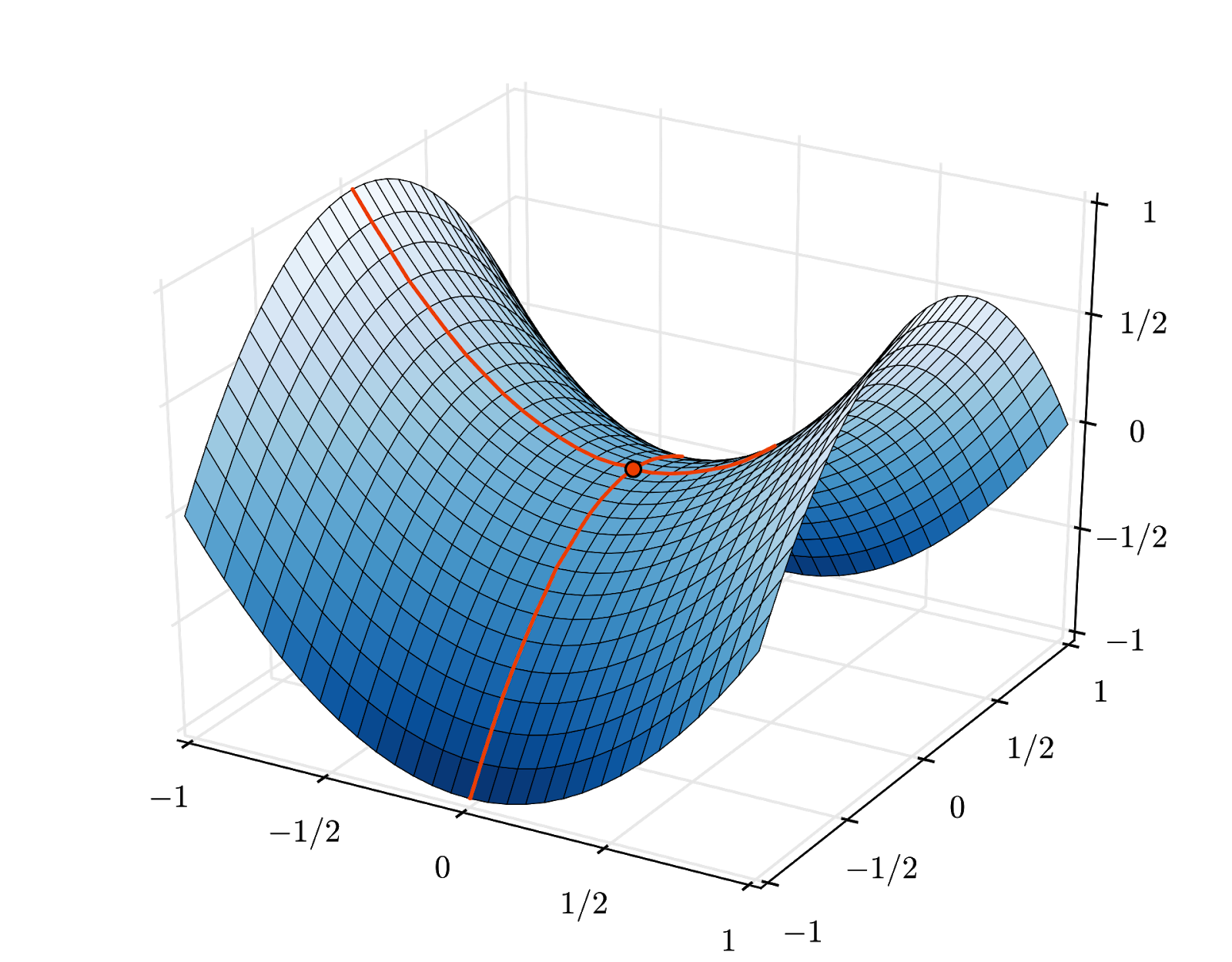 Ilustração: um ponto de sela. O gradiente é 0, mas não é um mínimo em todas as direções. (Atribuição da imagem: Wikimedia: Por Nicoguaro - Trabalho próprio, CC BY 3.0)