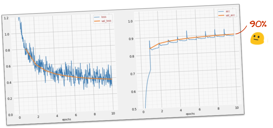 เส้นโค้งการฝึกนั้นมีสัญญาณรบกวนมาก และดูเส้นโค้งการตรวจสอบทั้ง 2 เส้น ซึ่งจะขึ้นๆ ลงๆ ซึ่งหมายความว่าเรากำลังทำเร็วเกินไป เราอาจกลับไปใช้ความเร็วเดิมได้ แต่ก็มีวิธีที่ดีกว่า