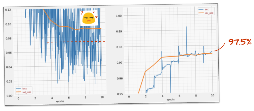 tf.keras.layers.Dense(200, activation='relu')โมเดลของคุณทำลายกำแพงความแม่นยำ 99% ได้หรือไม่ เกือบถูกแล้ว... แต่ดูที่เส้นโค้งการสูญเสียการตรวจสอบ คุ้นๆ ไหม