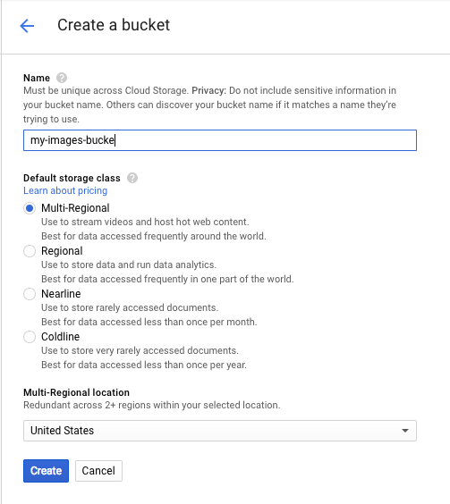 ছবি সনাক্তকরণের জন্য Vision API-এ একটি ছবি পাঠানোর দুটি উপায় রয়েছে: API-কে একটি base64 এনকোডেড ইমেজ স্ট্রিং পাঠিয়ে, অথবা Google ক্লাউড স্টোরেজে সঞ্চিত একটি ফাইলের URL দিয়ে। আমরা একটি ক্লাউড স্টোরেজ URL ব্যবহার করব৷ আমরা আমাদের ছবি সংরক্ষণ করার জন্য একটি Google ক্লাউড স্টোরেজ বালতি তৈরি করব।