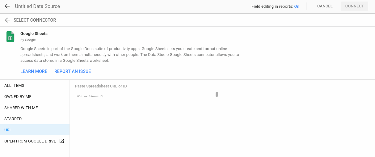 Paso 5: En el campo URL, ingresa la URL de la Hoja de cálculo de Google del paso 1.