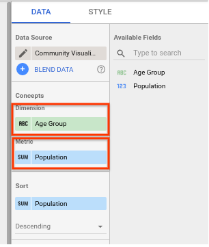 Dans cette section, vous allez mettre à jour votre visualisation pour dessiner un graphique à barres à l'aide des données de l'exemple d'ensemble de données de visualisation de la communauté. Remarque : Data Studio renvoie un maximum de 2 500 lignes de données à la visualisation.