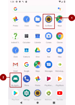 После установки приложения на устройство Android значок запуска приложения появляется на главном экране устройства и в других местах на нём. Например, значок запуска приложения Android Sunflower отображается в окне поиска приложений на устройстве и обозначен цифрой 1 на снимке экрана ниже. Значок запуска по умолчанию, обозначенный цифрой 2, изначально используется для всех проектов приложений, создаваемых в Android Studio.