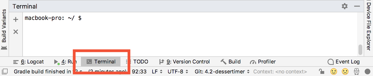- Android 스튜디오에서 터미널 탭을 클릭하여 명령줄 터미널을 엽니다.