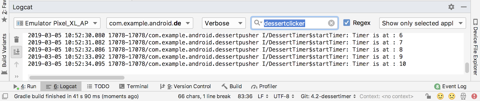 dessertclicker를 입력하면MainActivity및DessertTimer클래스 모두를 기준으로 필터링됩니다. 앱이 시작되면 타이머도 즉시 실행됩니다.