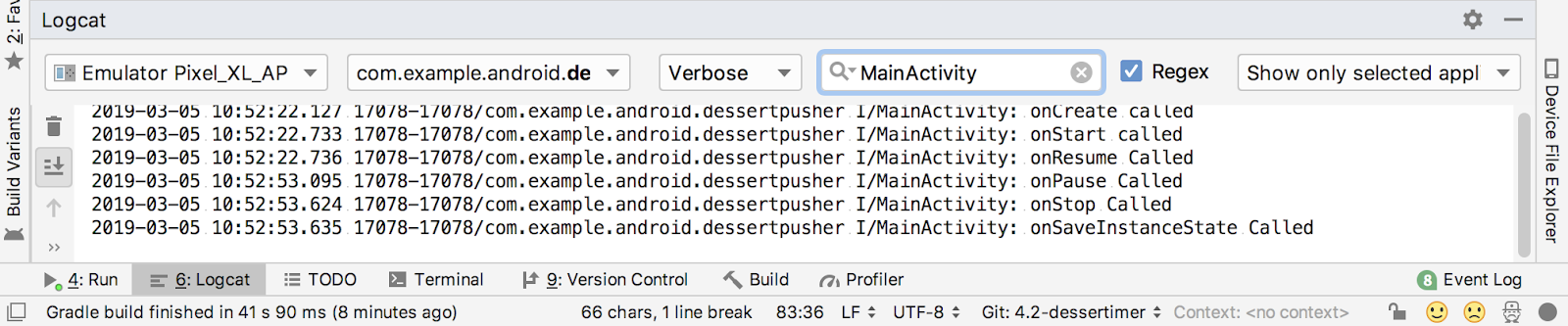 onCreate()의startTimer()호출과onStop()의stopTimer()호출을 삭제합니다. 이제DessertTimer가 수명 주기를 직접 관찰하고 수명 주기 상태가 변경되면 자동으로 알림을 받으므로 활동에서DessertTimer에 무엇을 해야 하는지 알려줄 필요가 없습니다. 이제 이러한 콜백에서 하는 일은 메시지를 로깅하는 것뿐입니다.- 앱을 컴파일하고 실행한 다음 Logcat을 엽니다. 타이머가 예상대로 실행되기 시작합니다.