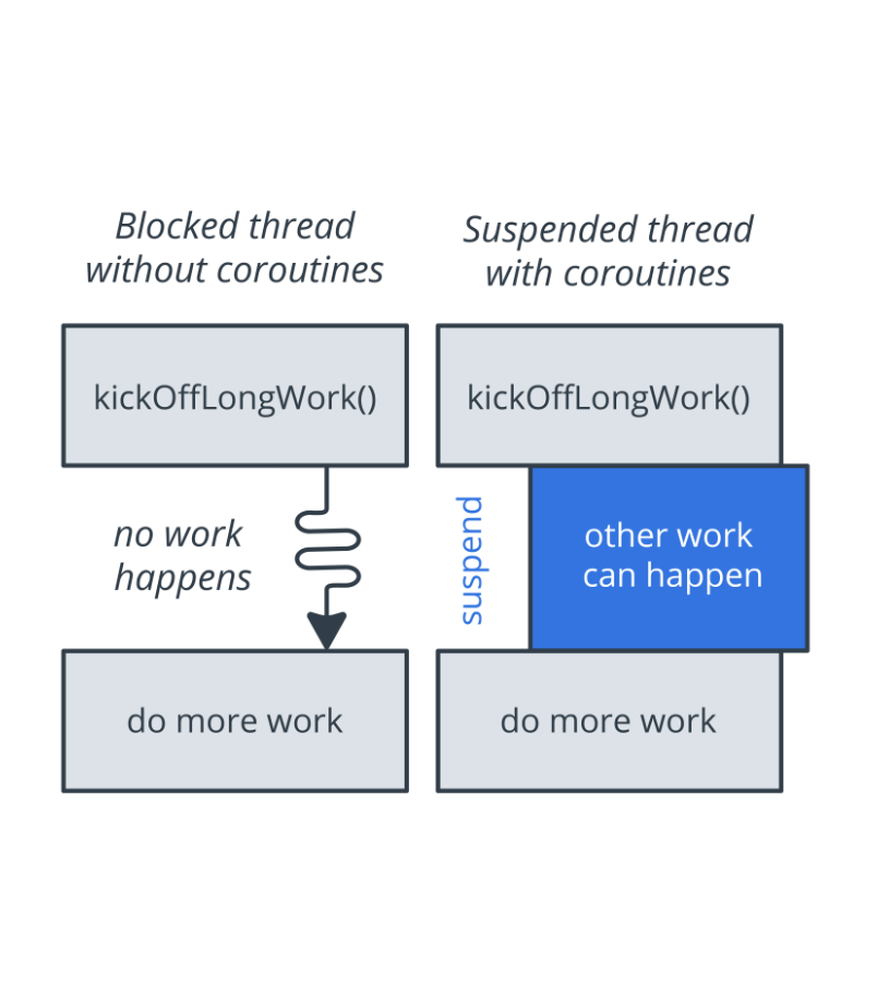 - Während eine suspend-Funktion ausgeführt wird, wird der aufrufende Thread angehalten.