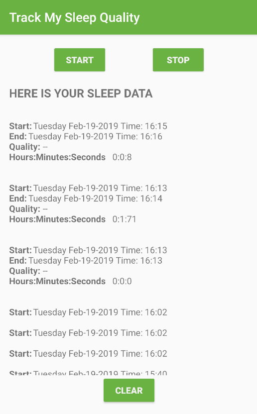 หน้าจอแรกที่แสดงทางด้านซ้ายมีปุ่มสำหรับเริ่มและหยุดการติดตาม หน้าจอจะแสดงข้อมูลการนอนหลับทั้งหมดของผู้ใช้ ปุ่มล้างจะลบข้อมูลทั้งหมดที่แอปเก็บรวบรวมไว้สำหรับผู้ใช้ออกอย่างถาวร