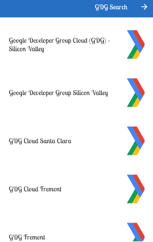 Während Sie diese App entwickeln, arbeiten Sie mit der tatsächlichen Liste der GDGs. Auf dem Finder-Bildschirm wird der Standort des Geräts verwendet, um die GDGs nach Entfernung zu sortieren.