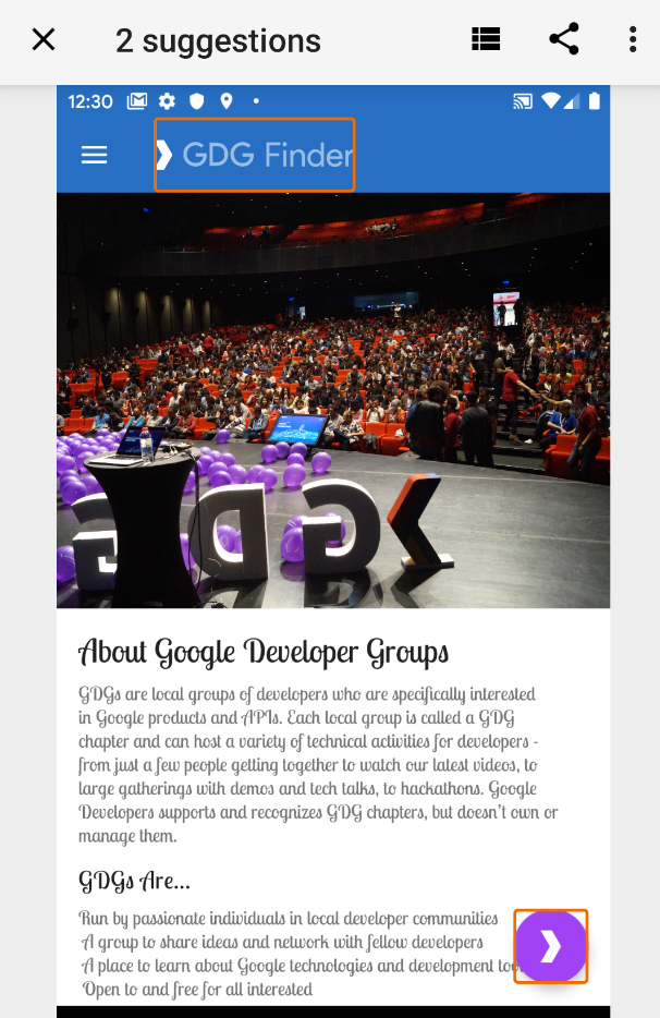 - In der Vorschau sehen Sie, dass die Kopfzeile „GDG Finder“ nach rechts verschoben wurde. Der Rest des Bildschirms bleibt weitgehend unverändert. Insgesamt ist dieser Bildschirm in Ordnung. Die Ausrichtung in der Textansicht ist jetzt jedoch falsch, da sie links statt rechts ausgerichtet ist.