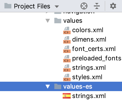 - پوشه res را باز کنید و به پوشههای res/values و res/values-es توجه کنید. "es" در نام پوشه، کد زبان اسپانیایی است. پوشه های values-"language code" حاوی مقادیری برای هر زبان پشتیبانی شده هستند. پوشه مقادیر بدون پسوند حاوی منابع پیشفرض است که در غیر این صورت اعمال میشوند.