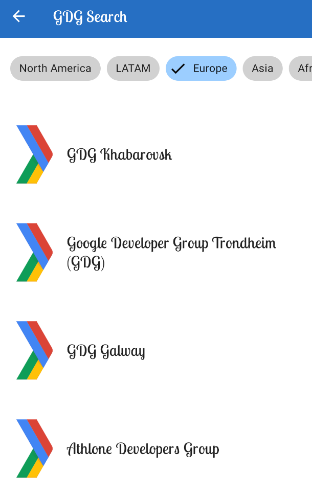 صفحه سوم یک یاب GDG است. GDGها یا Google Developer Groups، جوامعی از توسعهدهندگان هستند که بر فناوریهای Google از جمله Android تمرکز میکنند. GDG ها در سراسر جهان میزبان جلسات، کنفرانس ها، برنامه های آموزشی و رویدادهای دیگر هستند.