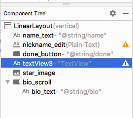 সতর্কতা লক্ষ্য করুন। এই সতর্কতা এই অ্যাপে প্রযোজ্য নয় এবং এই কোডল্যাবের সুযোগের বাইরে, তাই আপনি এটি উপেক্ষা করতে পারেন। (আপনি যদি অটোফিল সম্পর্কে আরও জানতে চান, অটোফিলের জন্য আপনার অ্যাপটি অপ্টিমাইজ করুন দেখুন।) - অ্যাট্রিবিউট প্যানে,
