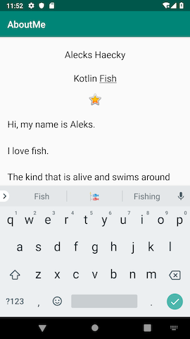 ב-codelab הזה, מרחיבים את האפליקציה AboutMe כדי להוסיף אינטראקציה עם המשתמש. מוסיפים שדה לכינוי, לחצן סיום ותצוגת טקסט להצגת הכינוי. אחרי שהמשתמש מזין כינוי ומקיש על הלחצן סיום, תצוגת הטקסט מתעדכנת ומוצג בה הכינוי שהוזן. המשתמש יכול לעדכן שוב את הכינוי על ידי הקשה על תצוגת הטקסט.
