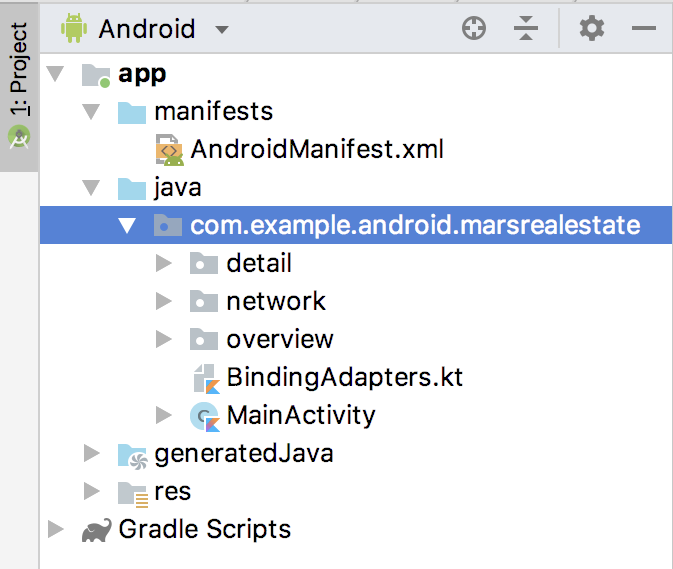 - Maximieren Sie im Bereich Project (Projekt) app > java. Die MarsRealEstate-App hat drei Paketordner: