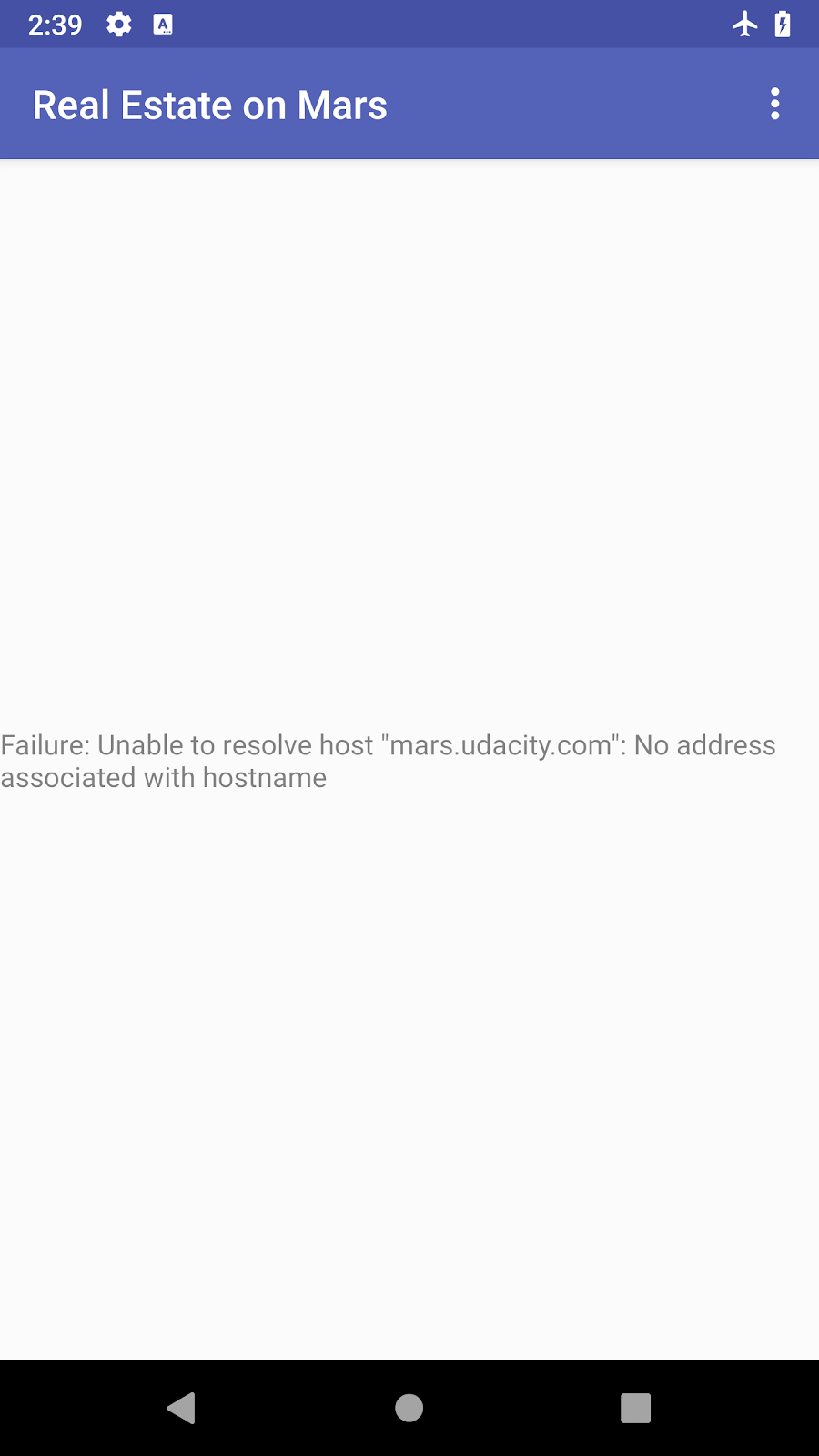 在此 Codelab(和接下来的 Codelab)中,您将使用一款名为 MarsRealEstate 的初始应用,该应用会显示火星上的待售资源。此应用需要连接到网络服务才能检索和显示资源数据,包括价格以及资源是可出售还是可租赁等详细信息。代表各项资源的图片是由 NASA 的火星探测器拍摄的真实照片。