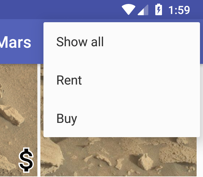 फ़िलहाल, आपका ऐप्लिकेशन खास जानकारी वाली ग्रिड में Mars की सभी प्रॉपर्टी दिखाता है. अगर कोई व्यक्ति मंगल ग्रह पर किराये की प्रॉपर्टी खोज रहा है, तो उसे यह बताने वाले आइकॉन दिखेंगे कि कौनसी प्रॉपर्टी बिक्री के लिए उपलब्ध हैं. हालांकि, पेज पर अब भी स्क्रोल करने के लिए कई प्रॉपर्टी मौजूद हैं. इस टास्क में, आपको खास जानकारी वाले फ़्रैगमेंट में एक विकल्प मेन्यू जोड़ना है. इससे उपयोगकर्ता, सिर्फ़ किराए पर उपलब्ध प्रॉपर्टी, सिर्फ़ बिक्री के लिए उपलब्ध प्रॉपर्टी या सभी प्रॉपर्टी दिखा पाएगा.