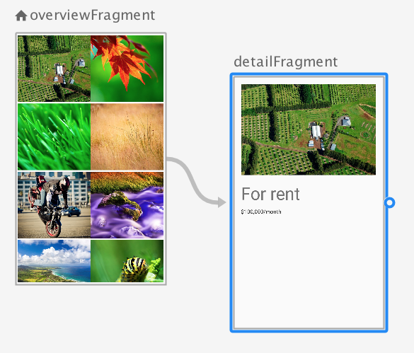 Terakhir, Anda akan membuat tampilan detail untuk setiap properti, dan menghubungkan ikon di petak ringkasan ke fragmen detail tersebut dengan navigasi: