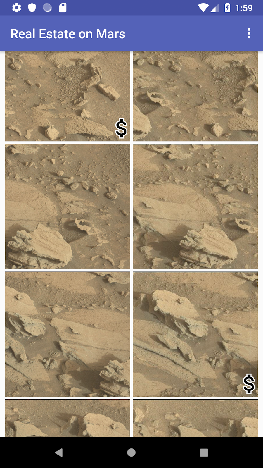 Dalam codelab ini (dan codelab terkait), Anda akan menggunakan aplikasi bernama MarsRealEstate, yang menampilkan properti yang dijual di Mars. Aplikasi ini terhubung ke server internet untuk mengambil dan menampilkan data properti, termasuk detail seperti harga dan apakah properti tersedia untuk dijual atau disewakan. Gambar yang merepresentasikan setiap properti adalah foto kehidupan nyata dari Mars yang diambil dari penjelajah Mars NASA. Dalam codelab sebelumnya, Anda membuat RecyclerView dengan tata letak petak untuk semua foto properti: