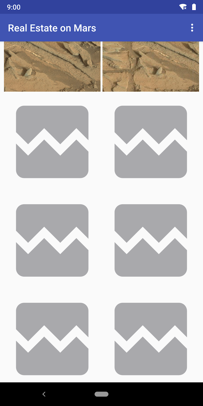 La version de l'application que vous allez créer dans cet atelier de programmation remplit la page de présentation en affichant une grille d'images. Les images font partie des données de propriété que votre application obtient du service Web immobilier Mars. Votre application utilisera la bibliothèque Glide pour charger et afficher les images, ainsi qu'un élément pour les mettre en page.RecyclerView Votre application pourra également gérer correctement les erreurs réseau.