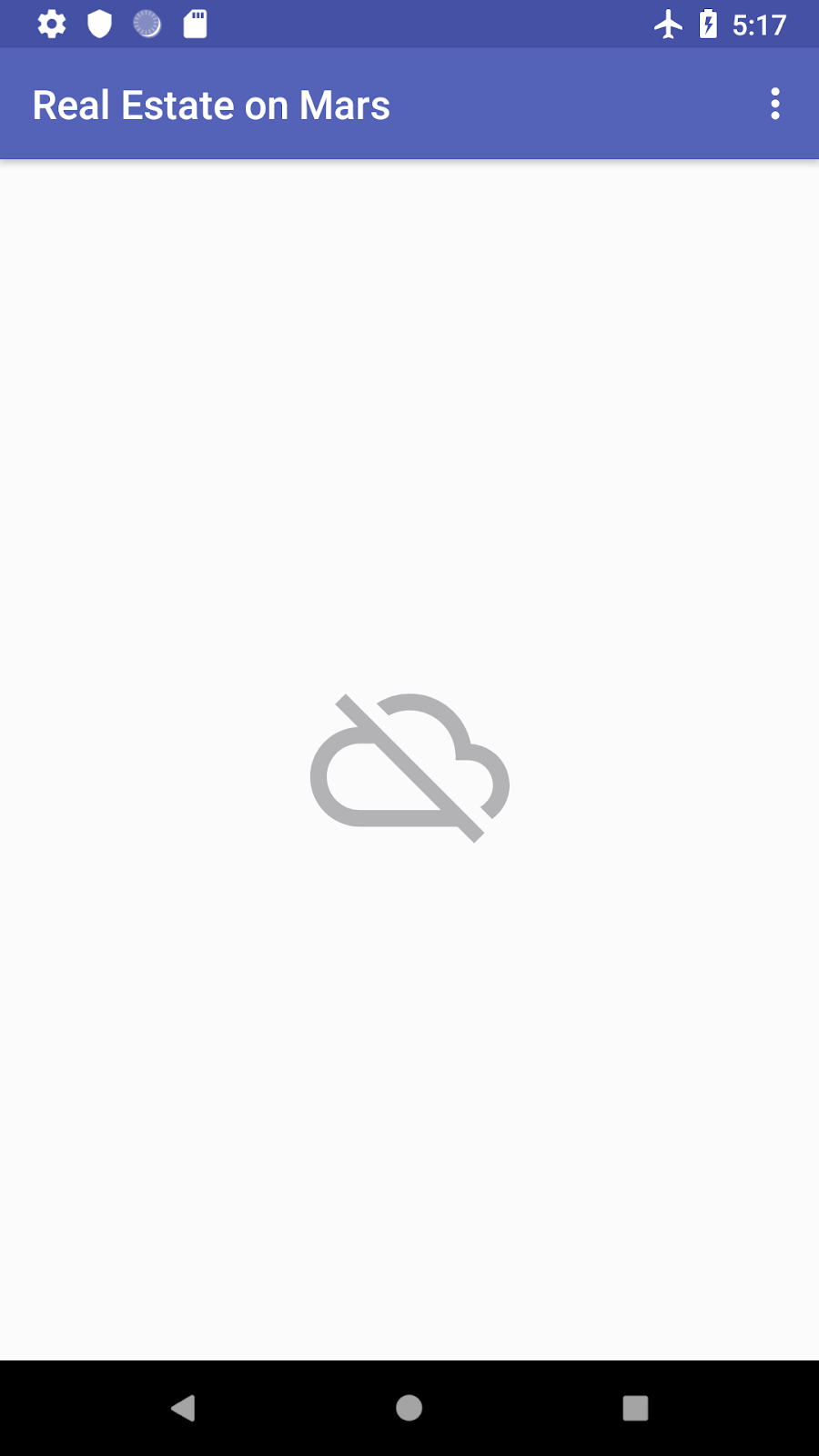 Ce n'est pas une expérience utilisateur optimale. Dans cette tâche, vous allez ajouter une gestion des erreurs basique dans le but de mieux informer l'utilisateur du problème. Si aucune connexion Internet n'est disponible, l'application devra afficher une icône d'erreur de connexion. Pendant que l'application extrait la liste MarsProperty, elle affiche une animation de chargement.