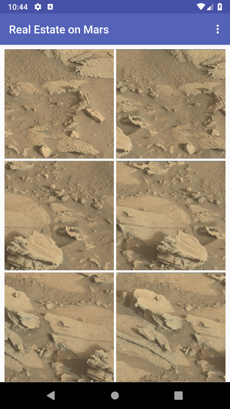 Versi aplikasi yang Anda buat dalam codelab ini akan terisi di halaman ringkasan, yang menampilkan petak gambar. Gambar adalah bagian dari data properti yang didapatkan aplikasi Anda dari layanan web properti Mars. Aplikasi Anda akan menggunakan library Glide untuk memuat dan menampilkan gambar, serta RecyclerView untuk membuat tata letak petak untuk gambar. Aplikasi Anda juga akan menangani error jaringan dengan baik.